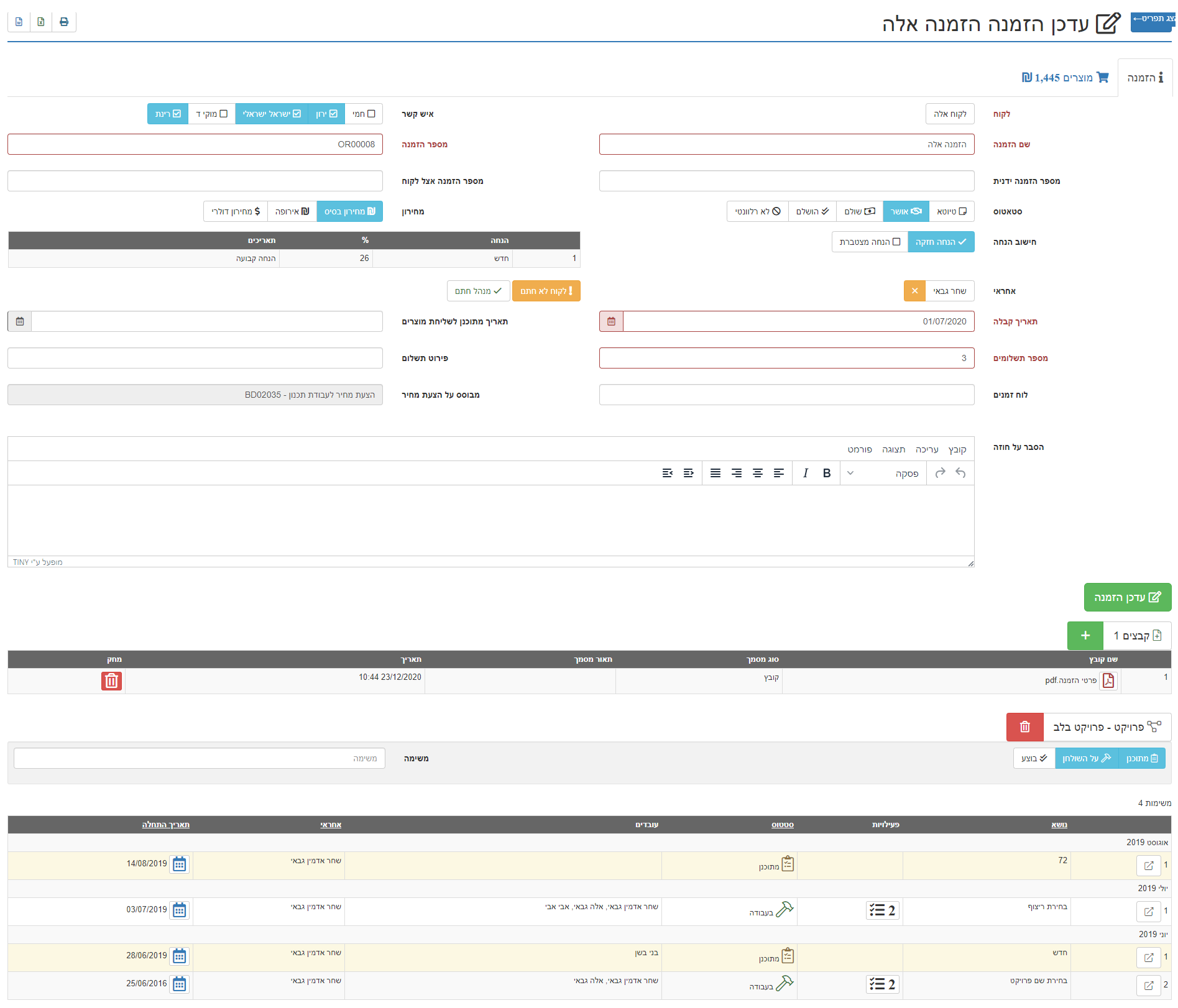 ניתן לשלב בהזמנה מגוון סוגי פרטים – מהגורמים האחראים מולם נעשית העבודה עם הלקוח והמוצרים הכלולים בהזמנה ועד לאמצעי התשלום וכל פרט אחר שנדרש לתהליך המכירה שלך. לכל הזמנה, ניתן לצרף קבצים חיוניים בקלות וביעילות. ניתן אפילו לשלב מוצרים מותאמים אישית שאינם כלולים ברשימת המוצרים המוכנה שלך.